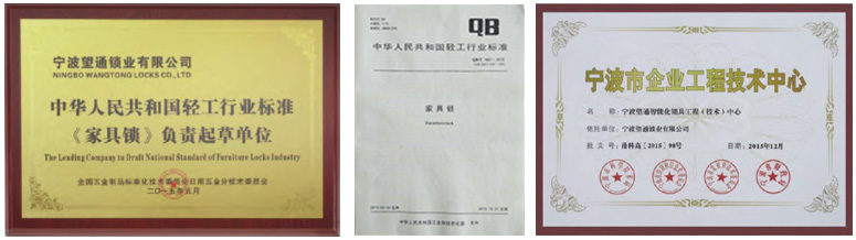 2015年:以我司为组长单位起草的《中国家具锁行业标准》,经过两年的努力,于2015年通过国家验收,并且于当年10月1日起正式实施。同年,被宁波市四部门授予“宁波市企业技术工程中心”。
