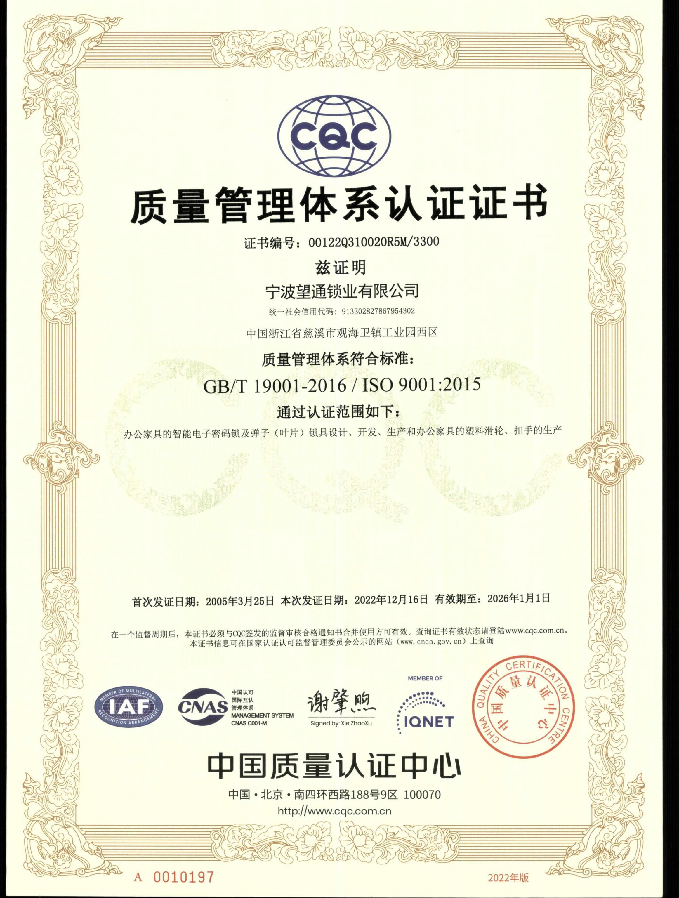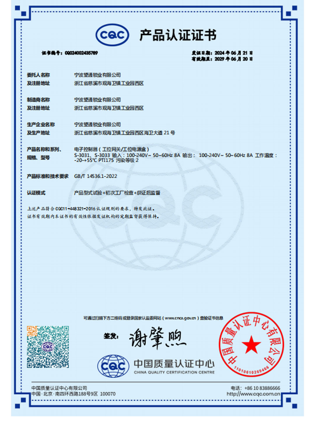 CQC产品认证证书