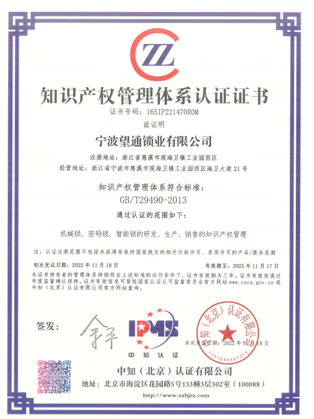 知识产权管理体系认证证书