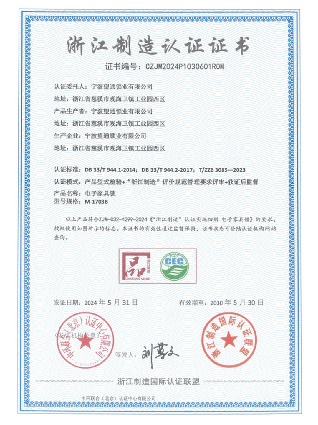 浙江制造认证证书